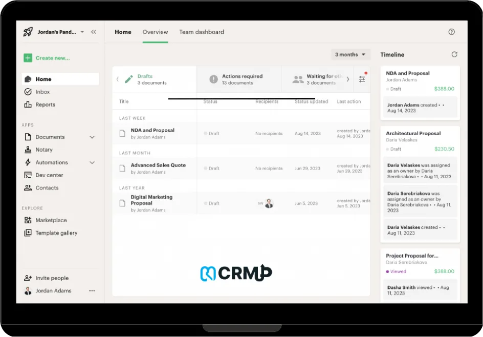 CRM UP partners with PandaDoc to bring revolutionary document automation to today’s collaborative workspaces. As a recognized PandaDoc certified partner, CRM Up specializes in leveraging this cutting-edge platform to streamline your document processes. PandaDoc’s innovative solution provides seamless electronic signatures, efficient workflow management, comprehensive CPQ functionality, and an intuitive document builder.